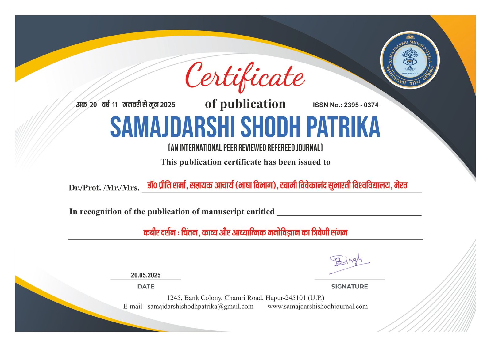 Welcome to Samajdarshi Shodh Patrika, a premier platform dedicated to the pursuit of knowledge, critical thinking, and impactful research. We are a peer-reviewed, multi-disciplinary journal committed to publishing high-quality scholarly work that addresses the evolving dynamics of society, culture, and science.